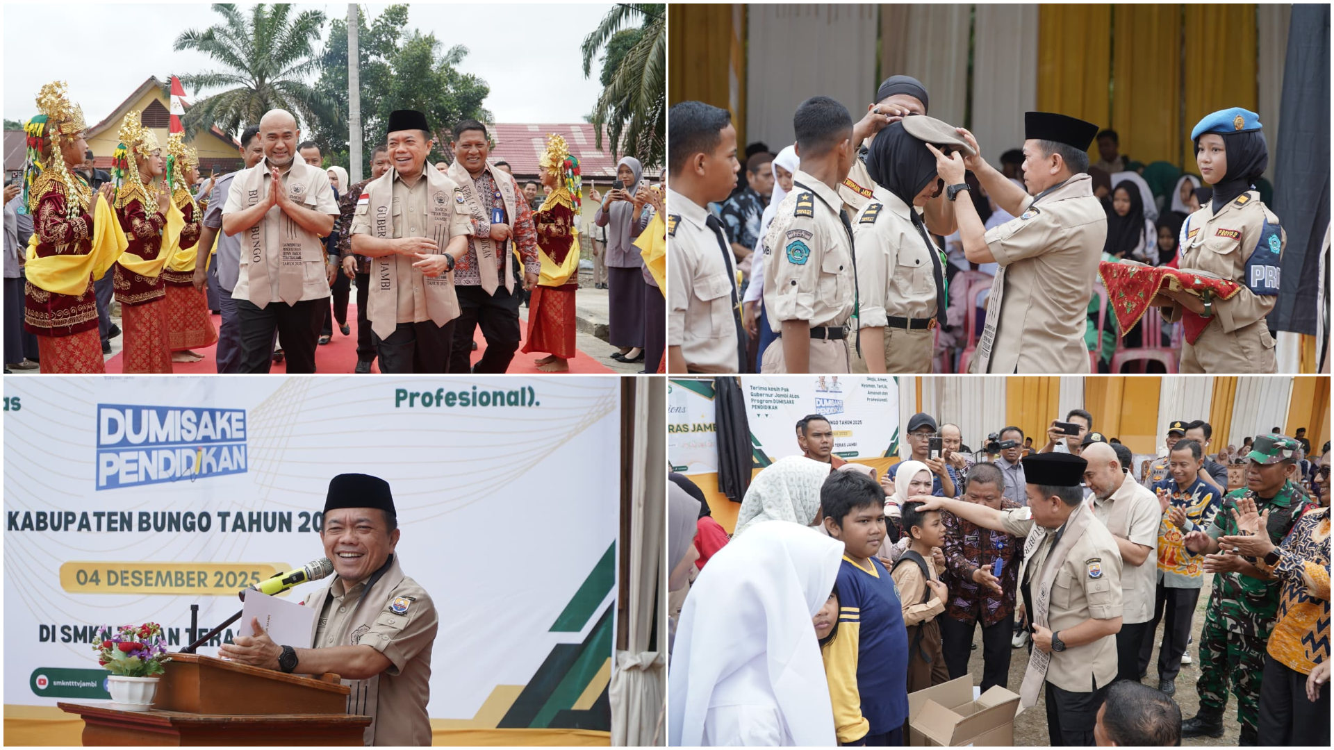 NEWS PUBLIK, Bungo (Diskominfo Provinsi Jambi) — Gubernur Jambi Dr. H. Al Haris, S.Sos, MH menegaskan bahwa generasi muda adalah aset bangsa yang perlu dipersiapkan secara maksimal melalui peningkatan Sumber Daya Manusia (SDM). Pernyataan ini disampaikan saat menyerahkan bantuan Dumisake Pendidikan untuk jenjang SMA, SMK, dan SLB Tahun 2025, sekaligus meresmikan SMK N Titian Teras Bungo serta melantik siswa-siswi baru, di SMK Negeri Titian Teras Babeko, Kecamatan Babeko, Kabupaten Bungo, Kamis (04/12/2025).