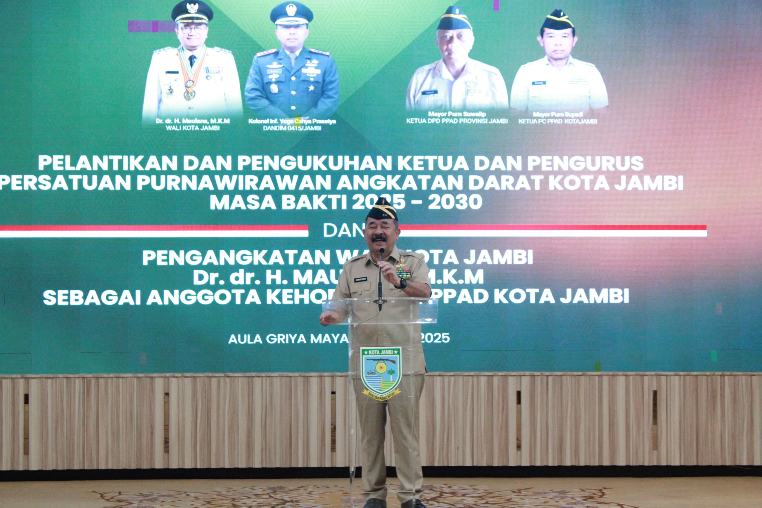 NEWS PUBLIK, Jambi (Diskominfo Provinsi Jambi) – Wakil Gubernur Jambi Drs. H. Abdullah Sani, M.Pd.I menghadiri pelantikan Persatuan Purnawirawan Angkatan Darat (PPAD) periode 2025 – 2030 Kota Jambi dan juga melantik Wali Kota Jambi Dr. dr. H. Maulana, MKM sebagai anggota kehormatan PPAD, bertempat di Gedung Griya Mayang Rumah Dinas Wali Kota Jambi, Senin (07/07/2025) pagi.