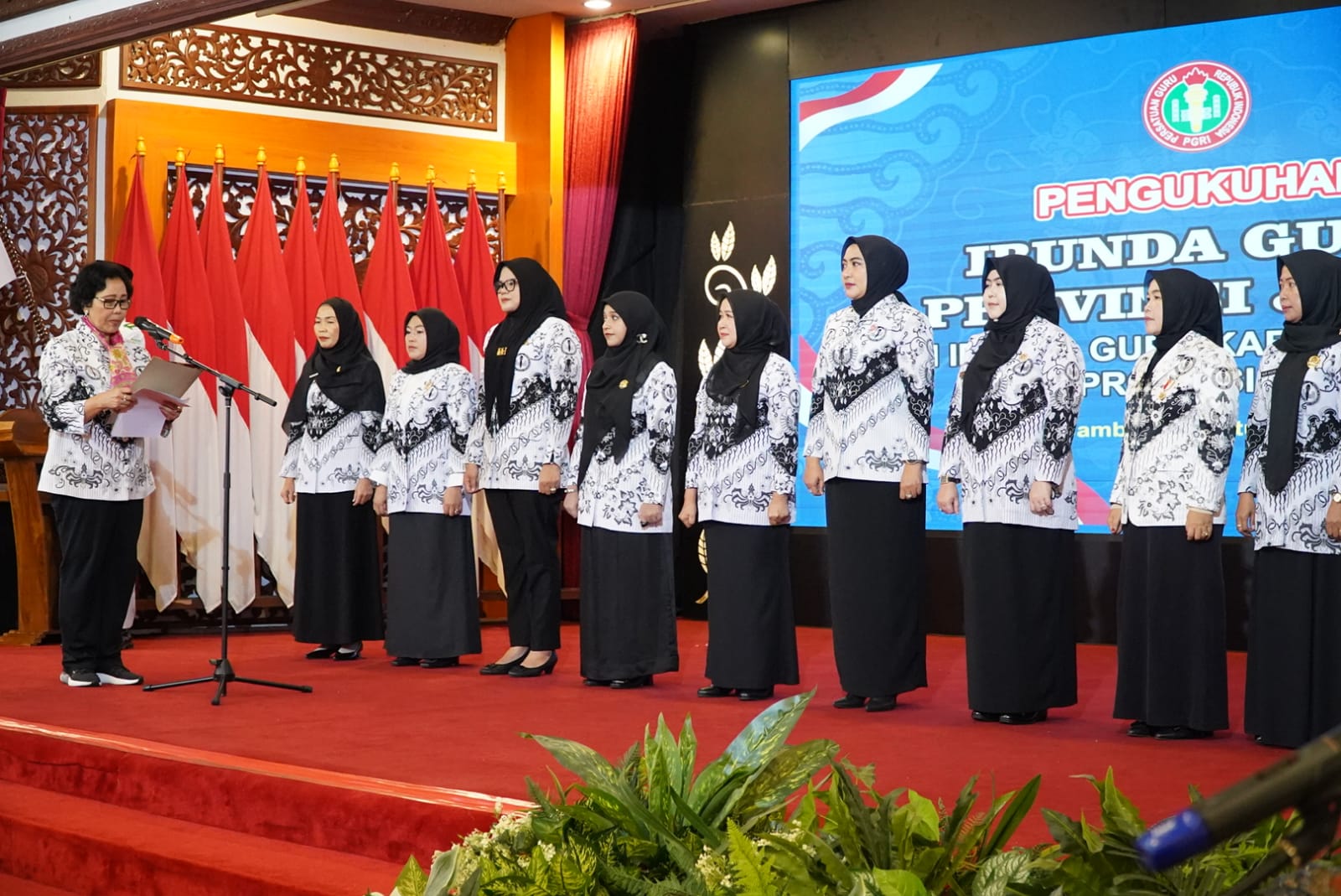 NEWS PUBLIK, Jambi (Diskominfo Provinsi Jambi) – Ketua TP-PKK Provinsi Jambi, Hj. Hesnidar Haris, SE (Hesti Haris), resmi dilantik dan dikukuhkan sebagai Ibunda Guru Provinsi Jambi. Pada kesempatan yang sama, turut dilantik dan dikukuhkan pula para Ibunda Guru Kabupaten/Kota se-Provinsi Jambi. Pengukuhan ini dilaksanakan oleh Ketua Umum Pengurus Besar Persatuan Guru Republik Indonesia (PB PGRI), Prof. Dr. Unifah Rasyidi, M.Pd., bertempat di Auditorium Rumah Dinas Gubernur Jambi, Kamis (07/08/2025) pagi.