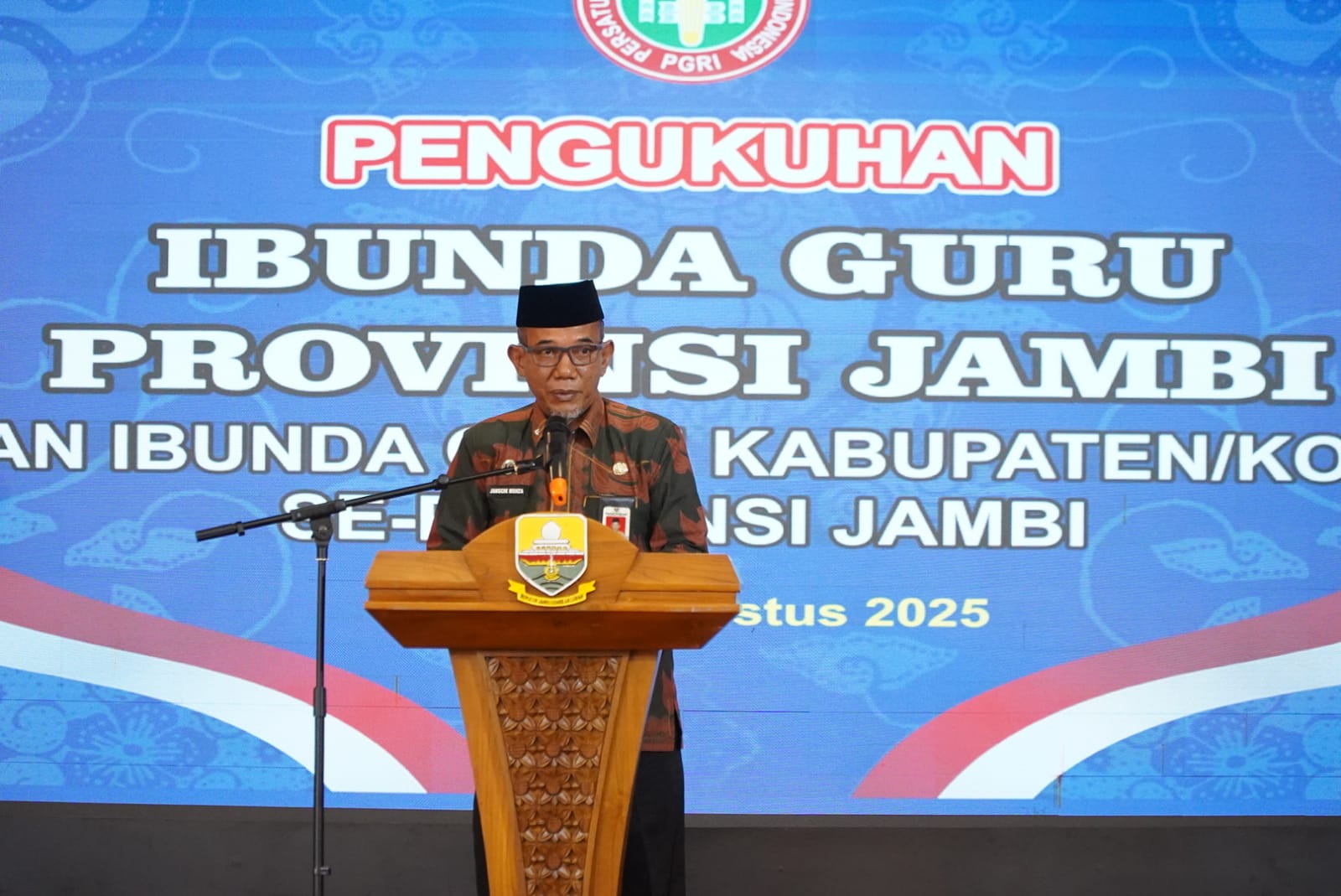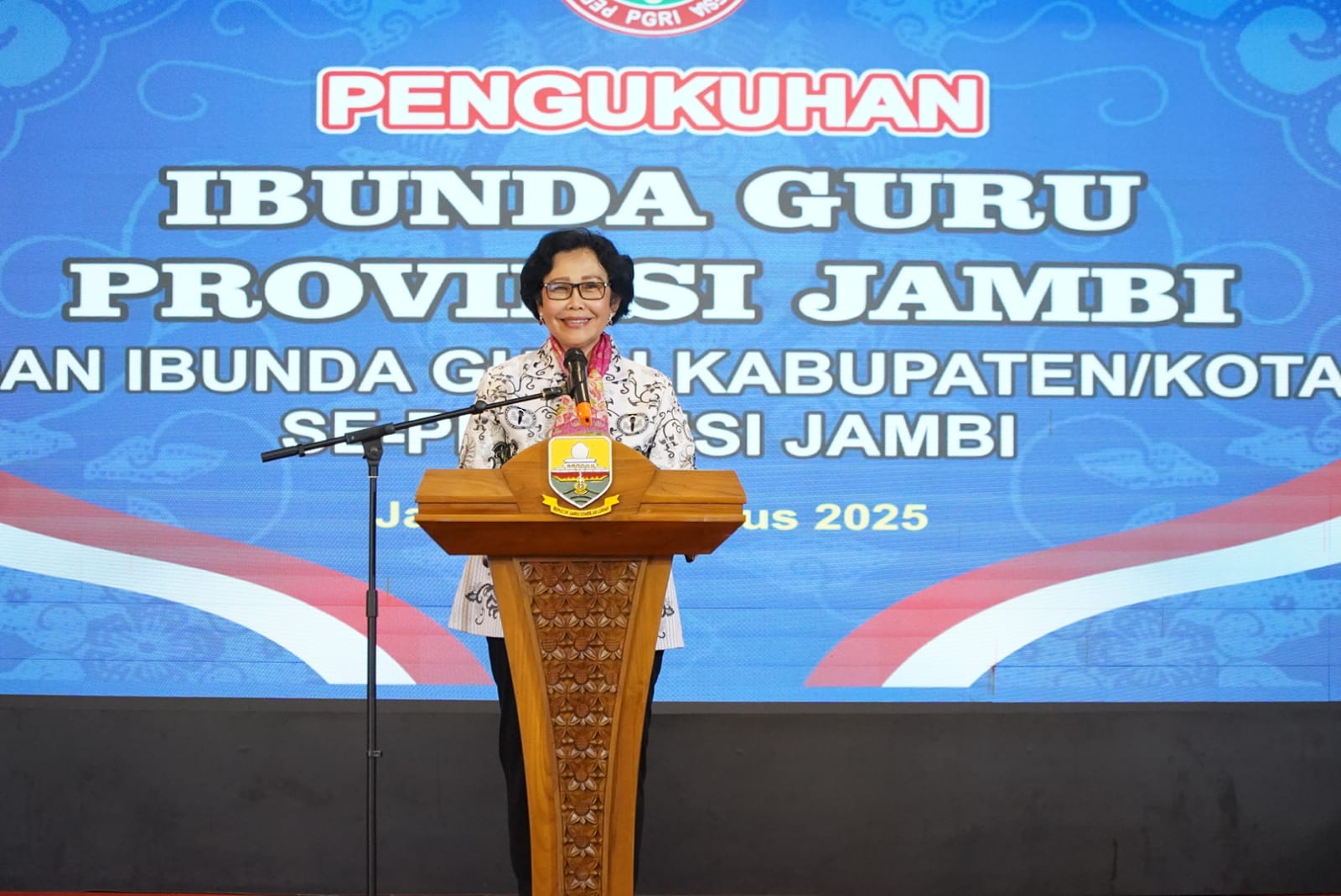 NEWS PUBLIK, Jambi (Diskominfo Provinsi Jambi) – Ketua TP-PKK Provinsi Jambi, Hj. Hesnidar Haris, SE (Hesti Haris), resmi dilantik dan dikukuhkan sebagai Ibunda Guru Provinsi Jambi. Pada kesempatan yang sama, turut dilantik dan dikukuhkan pula para Ibunda Guru Kabupaten/Kota se-Provinsi Jambi. Pengukuhan ini dilaksanakan oleh Ketua Umum Pengurus Besar Persatuan Guru Republik Indonesia (PB PGRI), Prof. Dr. Unifah Rasyidi, M.Pd., bertempat di Auditorium Rumah Dinas Gubernur Jambi, Kamis (07/08/2025) pagi.