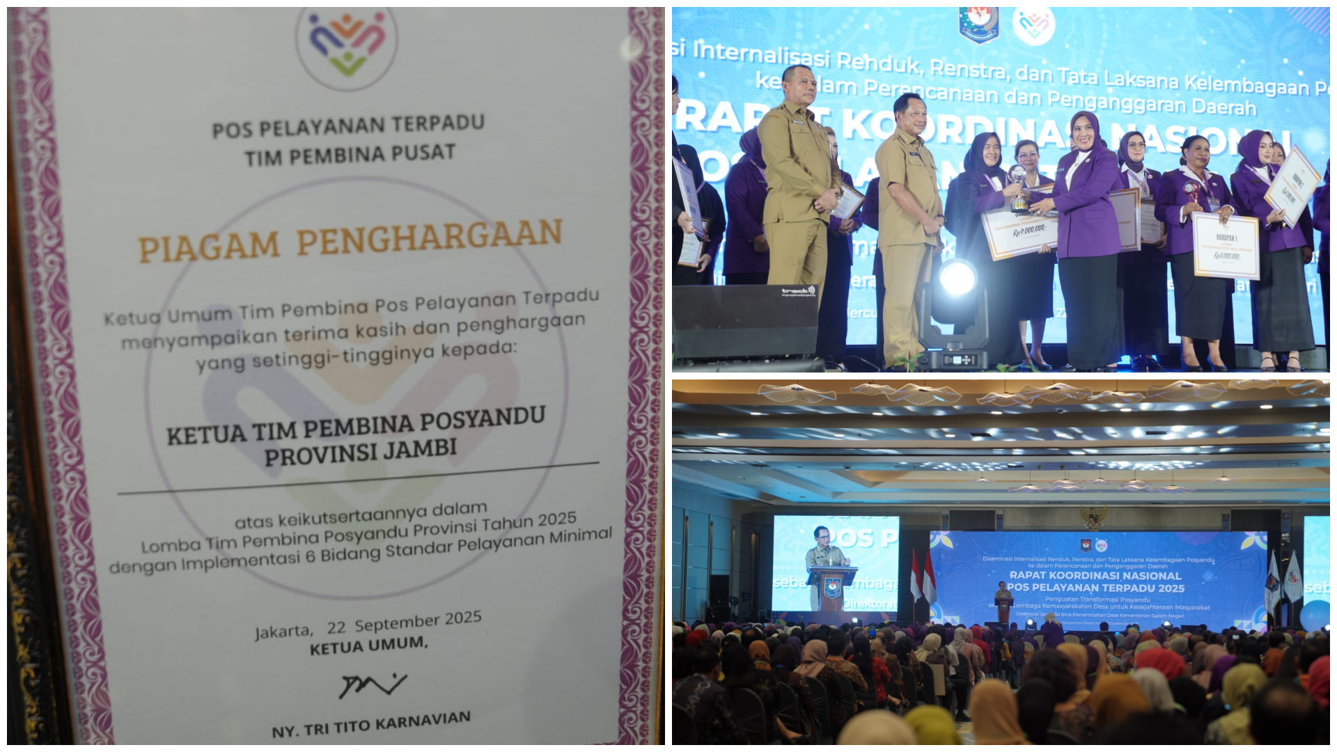 Ketua Tim Pembina Posyandu Provinsi Jambi, Hj. Hesnidar Haris (Hesti Haris), menerima penghargaan peringkat kedua nasional dalam Lomba TP Posyandu Tahun 2025 di Jakarta.