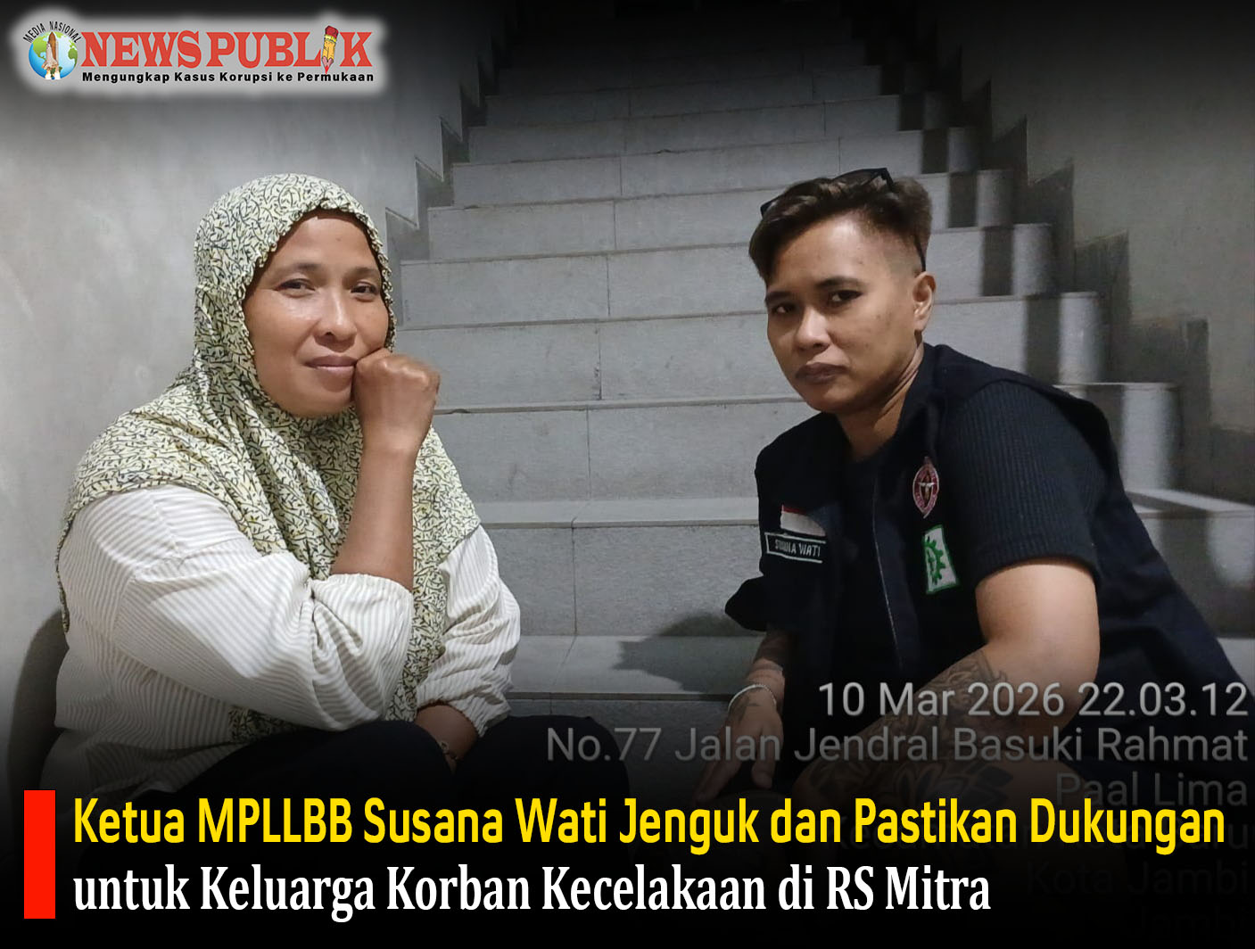 NEWS PUBLIK | Jambi – Ketua Masyarakat Peduli Lalu Lintas Batu Bara (MPLLBB), Susana Wati, kembali menunjukkan kepeduliannya terhadap korban kecelakaan lalu lintas. Ia mendatangi Rumah Sakit Mitra pada Selasa malam, 10 Maret 2026 sekitar pukul 22.03 WIB, untuk menjenguk keluarga korban kecelakaan yang terjadi di kawasan Penerokan Km 34, Desa Tanjung Pauh 32.