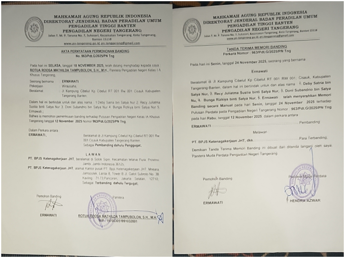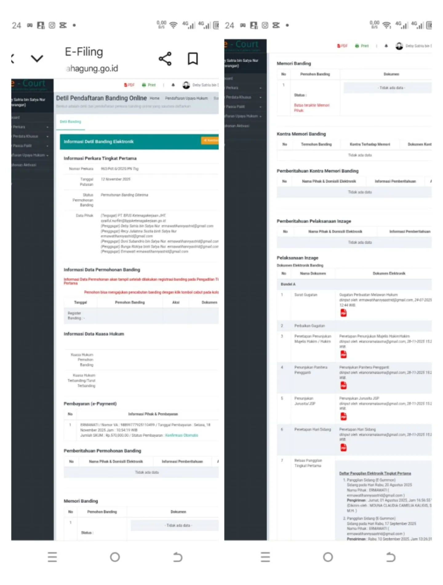 Pemohon telah menyerahkan memori banding secara resmi kepada PN Tangerang dan menerima keterangan bahwa berkas telah diunggah pada 24 November 2025. Namun hingga berita ini diturunkan, dokumen tersebut belum muncul pada sistem e-Court Mahkamah Agung.