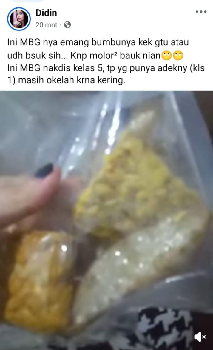 “Ini MBG-nya emang bumbunya seperti itu atau sudah busuk sih? Kenapa baunya molor sekali. Ini MBG anakku yang kelas 5, tapi yang punya adeknya kelas 1 masih okelah karena kering,” tulisnya.
