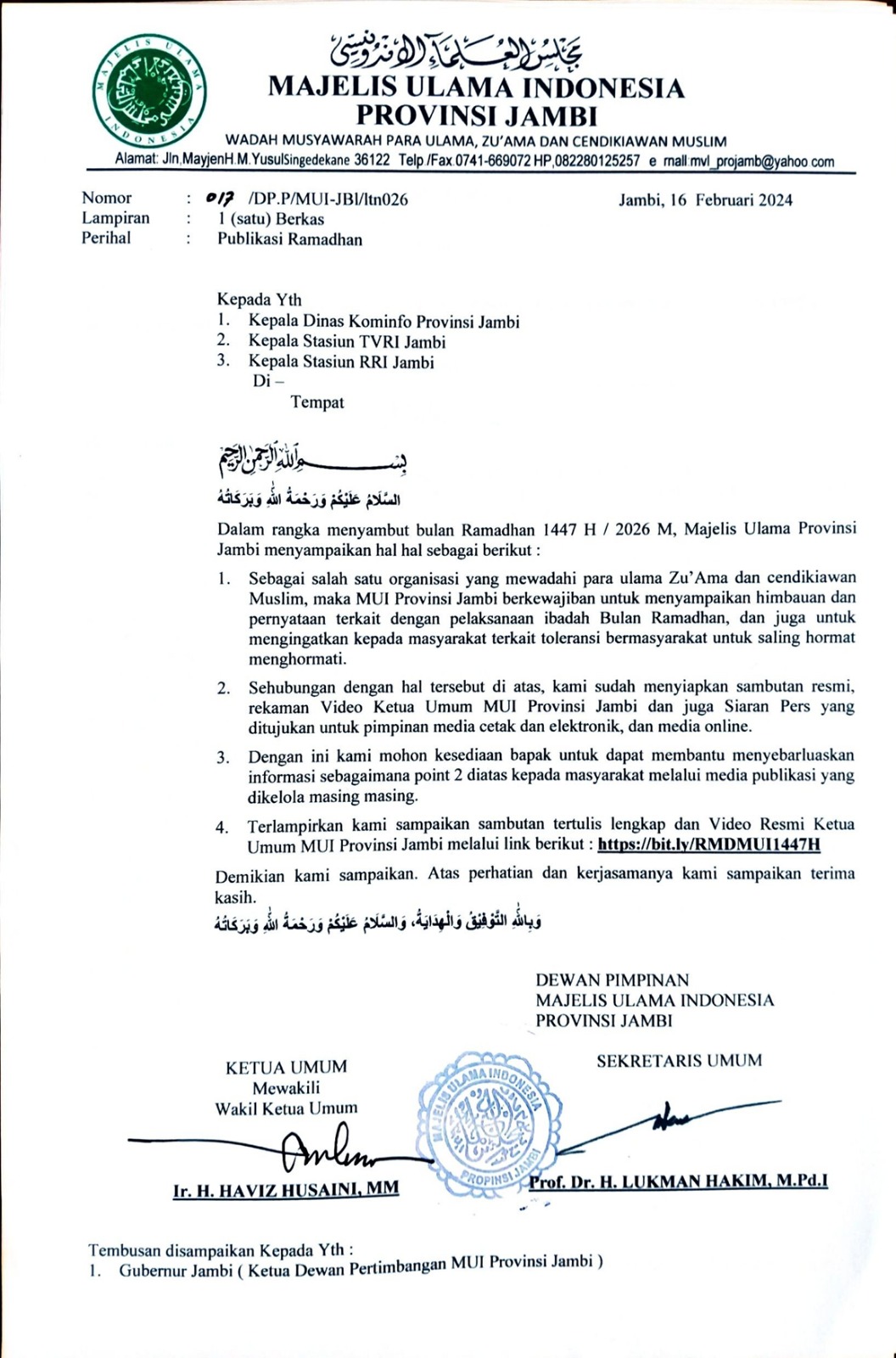 Ketua Umum MUI Provinsi Jambi, melalui Wakil Ketua Umum Ir. H. Haviz Husaini, MM, dan Sekretaris Umum Prof. Dr. H. Lukman Hakim, M.Pd.I, menyampaikan bahwa Ramadhan bukan sekadar ritual ibadah, melainkan momentum bagi umat untuk meningkatkan kualitas moral dan kepedulian sosial.