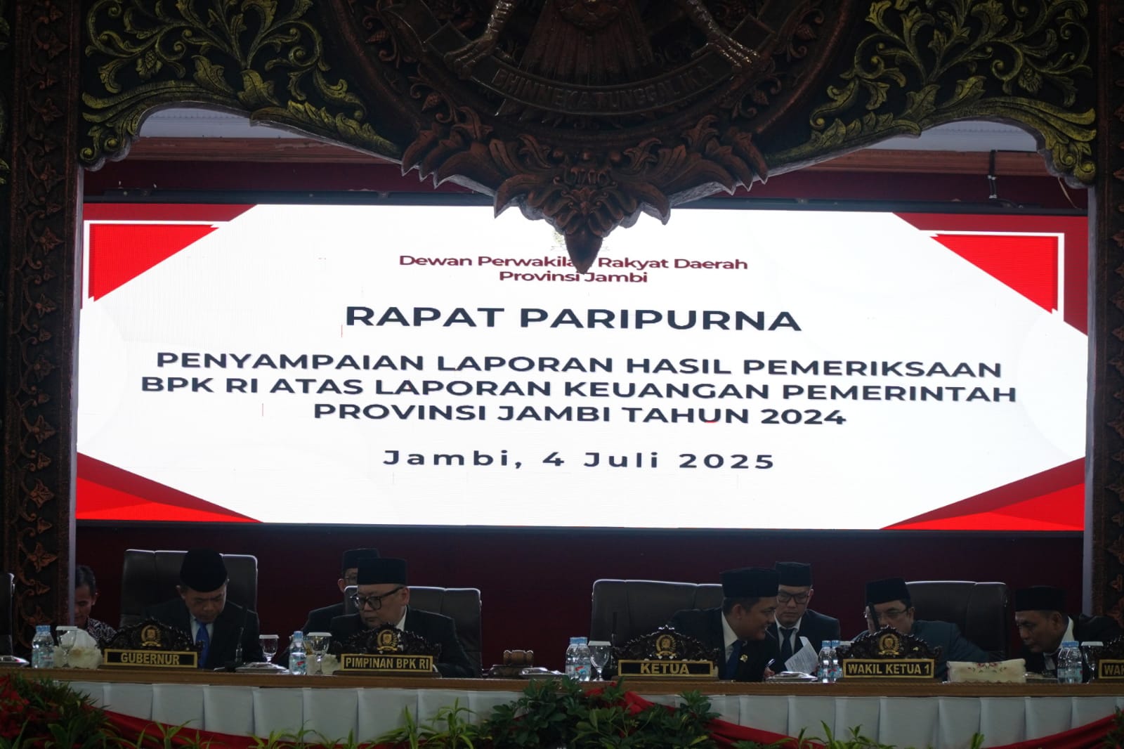 NEWS PUBLIK, Jambi (Diskominfo Provinsi Jambi) – Gubernur Jambi Dr. H. Al Haris, S.Sos, MH mengemukakan, Pemerintah Provinsi Jambi berkomitmen akan memperbaiki setem yang lebih baik lagi, dan akan memperbaiki atas laporan keuangan ini dilakukan untuk memberikan keyakinan terhadap penyusunan dan penyajian Laporan Keuangan secara wajar, sesuai prinsip akuntansi yang ditetapkan dalam standar. Hal tersebut dikemukakan Gubernur saat mengikuti Rapat Paripurna DPRD Provinsi Jambi Dalam Rangka Penyerahan Laporan Hasil Pemeriksaan (LHP) Laporan Keuangan Pemerintah Daerah (LKPD) Provinsi Jambi Tahun 2024, bertempat di Ruang Rapat Utama Gedung DPRD Provinsi Jambi, Jum’at (04/07/2025).