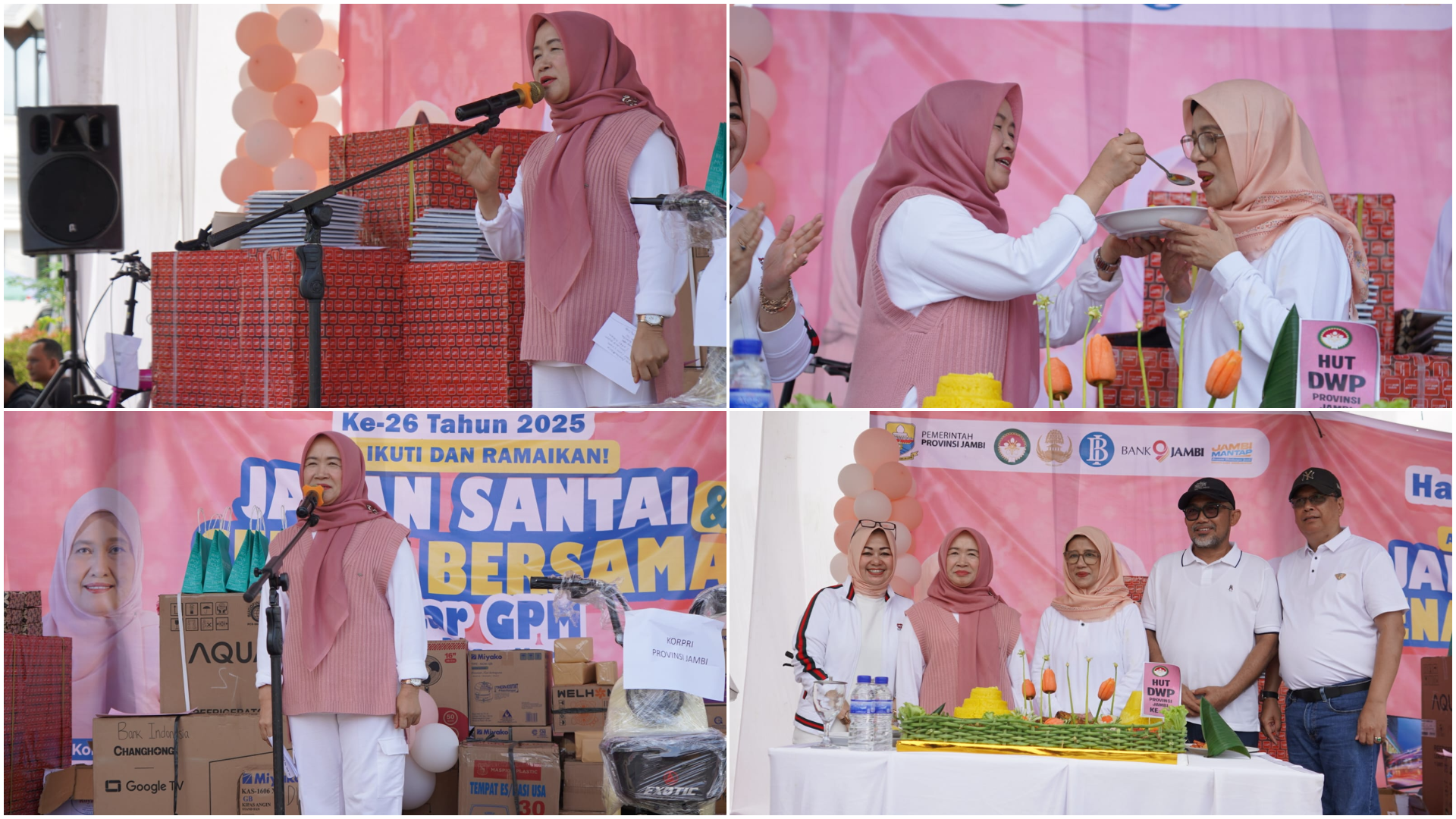 Kegiatan diawali dengan jalan santai dan senam bersama, kemudian dilanjutkan peninjauan Pasar Murah, pemotongan tumpeng oleh Ketua TP-PKK Provinsi Jambi Hj. Hesti Haris, serta berbagai kegiatan sosial dan edukatif yang melibatkan seluruh anggota DWP.