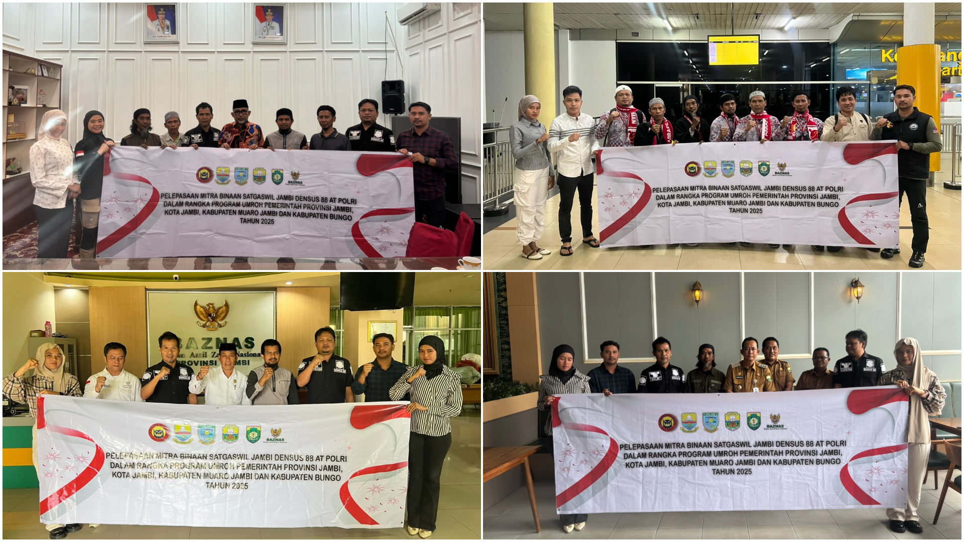 NEWS PUBLIK, Jambi (Diskominfo Provinsi Jambi) – Empat warga binaan terorisme dari Provinsi Jambi resmi diberangkatkan untuk melaksanakan ibadah umroh. Keberangkatan ini merupakan hasil kolaborasi antara Densus 88 AT Polri Provinsi Jambi dengan Pemerintah Provinsi Jambi, Baznas Provinsi Jambi, Baznas Kota Jambi, Baznas Kabupaten Muaro Jambi, dan Baznas Kabupaten Muaro Bungo.