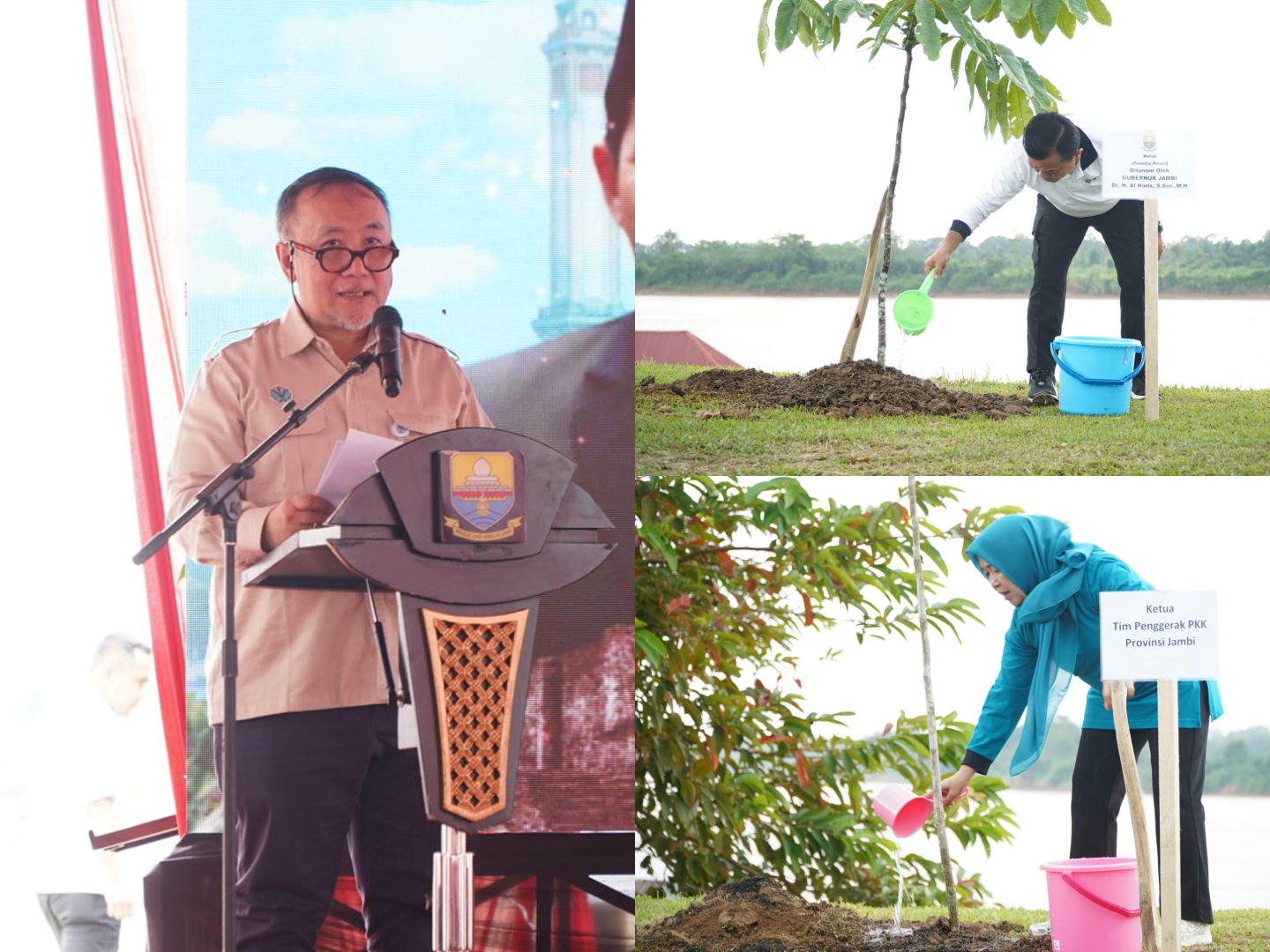 NEWS PUBLIK, MUARO JAMBI, Pematang Jering – Staf Ahli Menteri Lingkungan Hidup Bidang Kelestarian Sumber Daya Keanekaragaman Hayati dan Sosial Budaya Nur Adi Wardoyo menyatakan bahwa Provinsi Jambi dapat dijadikan contoh yang menggerakkan penanaman pohon serentak di Indonesia. Pernyataan ini disampaikannya saat Penanaman Pohon Serentak se-Provinsi Jambi dalam rangkaian HUT Ke-69 Provinsi Jambi, bertempat di Sempadan Sungai Batanghari, Dusun Tuo, Desa Pematang Jering Kecamatan Jambi Luar Kota, Kabupaten Muaro Jambi, Rabu (28/01/2026). Hadir pada kesempatan tersebut Gubernur Jambi Dr. H. Al Haris, S.Sos, MH, Bupati Muaro Jambi Bambang Bayu Suseno, Forkopimda Provinsi Jambi, dan Ketua TP-PKK Provinsi Jambi Hj. Hesnidar Haris, SE (Hesti Haris) serta tamu undangan lainnya.