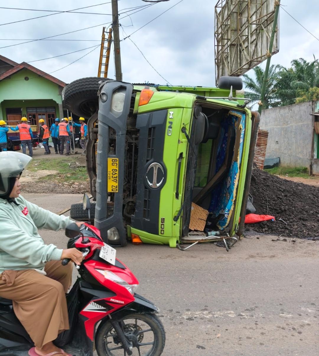 NEWS PUBLIK | MUARO JAMBI  – Dentuman keras memecah sunyi dini hari di Tempino. Selasa (24/02/2026) sekitar pukul 03.00 WIB, satu unit truk Fuso Hino bernopol BG 8639 ZQ bermuatan 42,4 ton batu bara terguling di Jalan Lintas Jambi–Tempino KM 27, tepat di depan SPBU Tempino.