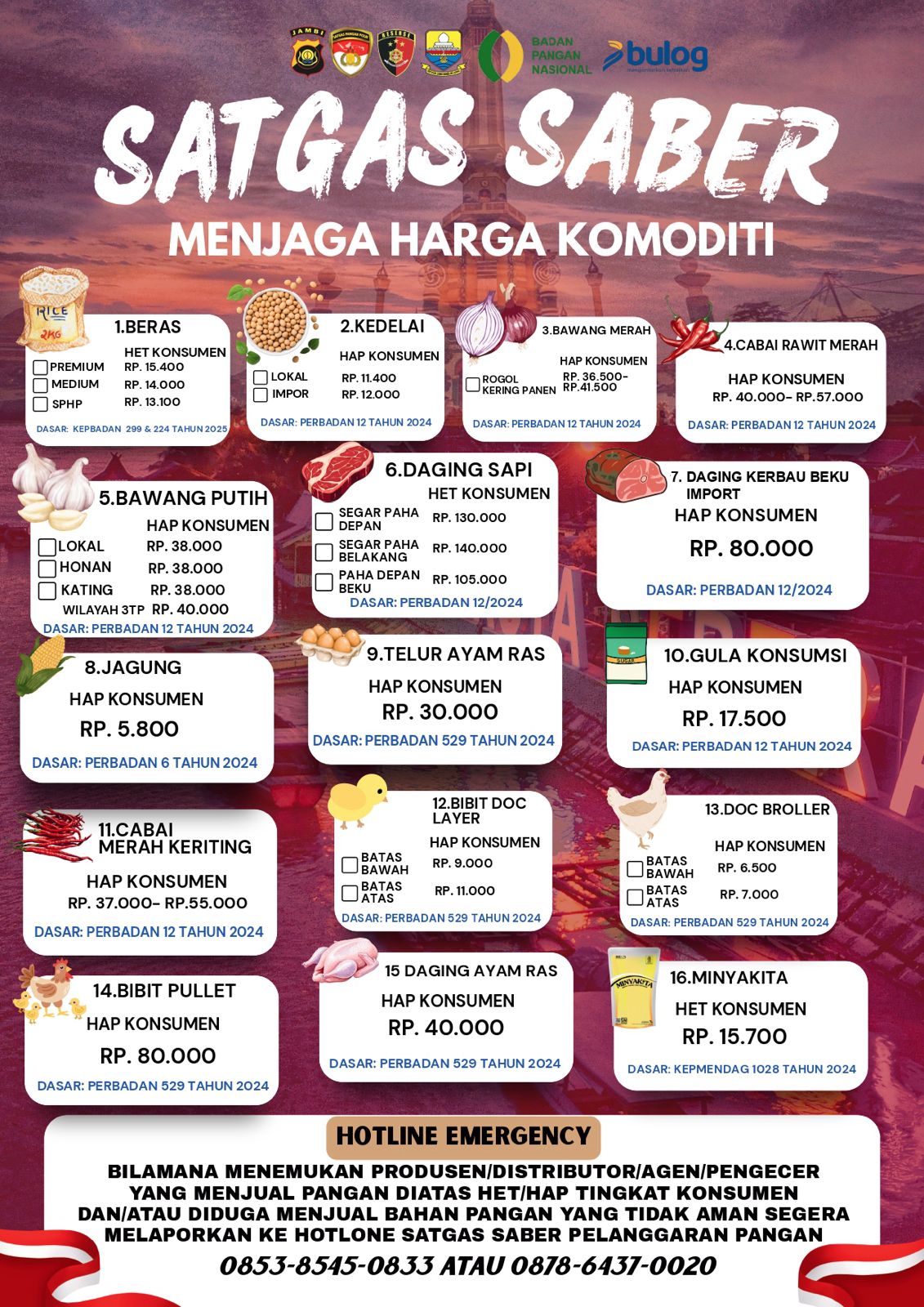 Pemerintah melalui Satgas Saber turut menyampaikan informasi resmi terkait batas Harga Eceran Tertinggi (HET) dan Harga Acuan Pembelian (HAP) tingkat konsumen. Beberapa komoditas yang diatur antara lain beras premium Rp.15.400 per kilogram, beras medium Rp.14.000, beras SPHP Rp.13.100, gula konsumsi Rp.17.500, telur ayam ras Rp.30.000, daging ayam ras Rp.40.000, serta Minyakita Rp.15.700. Ketentuan harga tersebut mengacu pada regulasi terbaru tahun 2024β2025 dan bertujuan menjaga stabilitas harga serta melindungi konsumen. Pemerintah juga menyiapkan intervensi seperti Gerakan Pangan Murah (GPM), operasi pasar, serta memperbanyak mitra Rumah Pangan Kita (RPK) melalui Bulog.